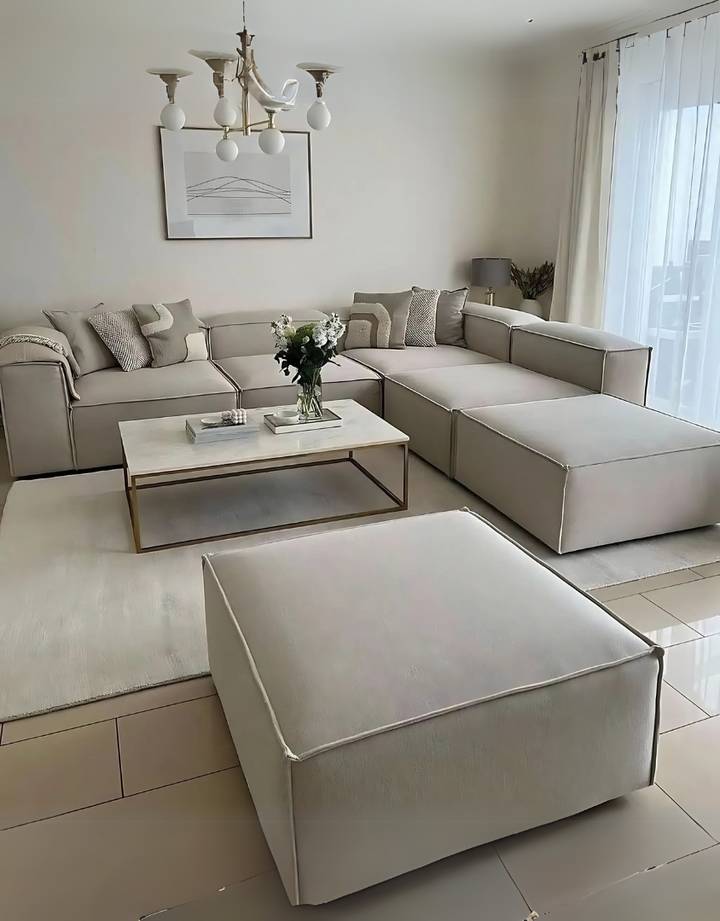 كنبة ركنة و 2 بوف خشب طبيعي و قماش كتان - بيج غامق كود sofa10047